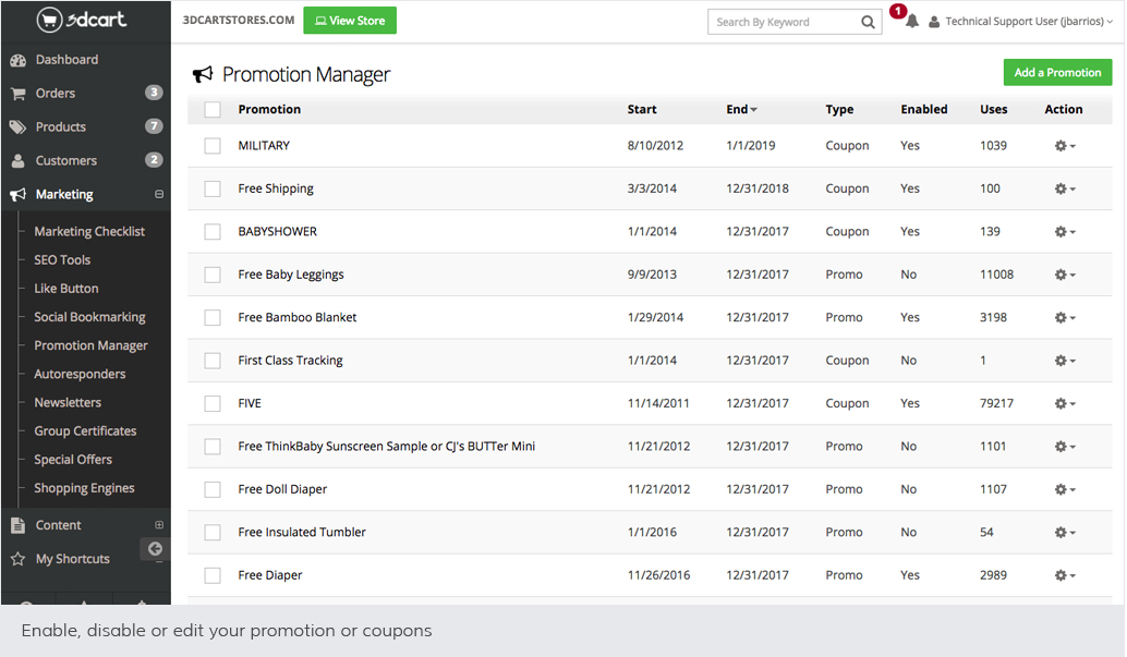 At the left of your Shift4Shop Online Store Manager, click Marketing, and then click Promotion Manager. All your promotions and coupons are managed from this central location.