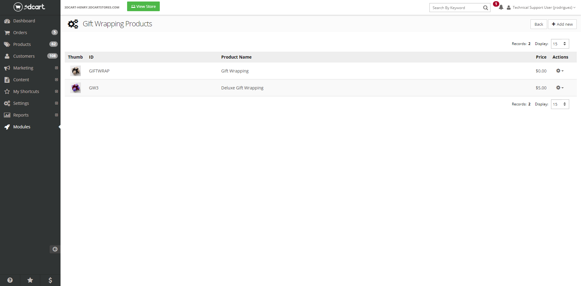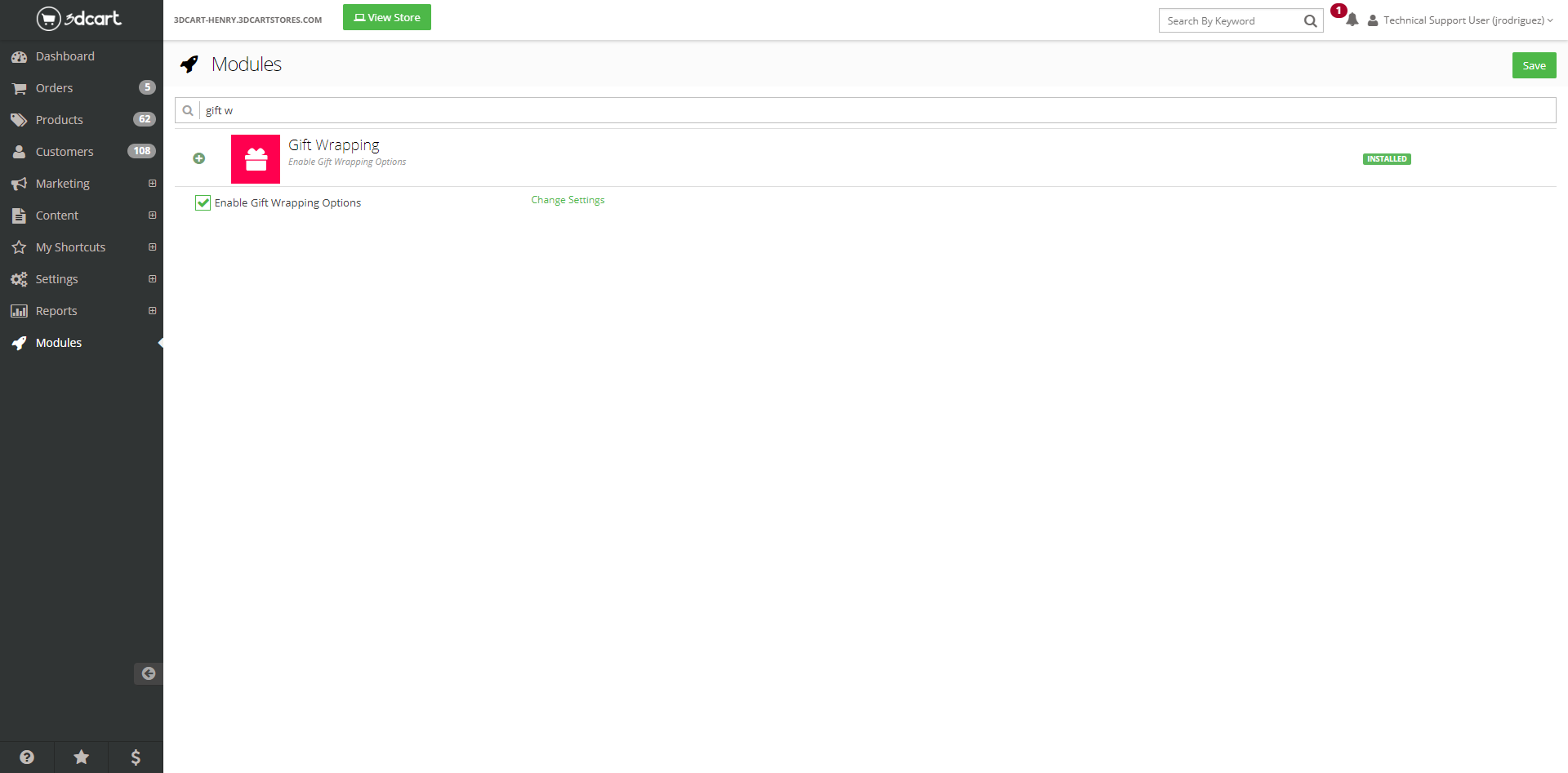Under Modules in your Shift4Shop Online Store Manager, use the Search Bar or scroll down until you find Gift Wrapping. Click to expand the module, activate it, and access its settings.