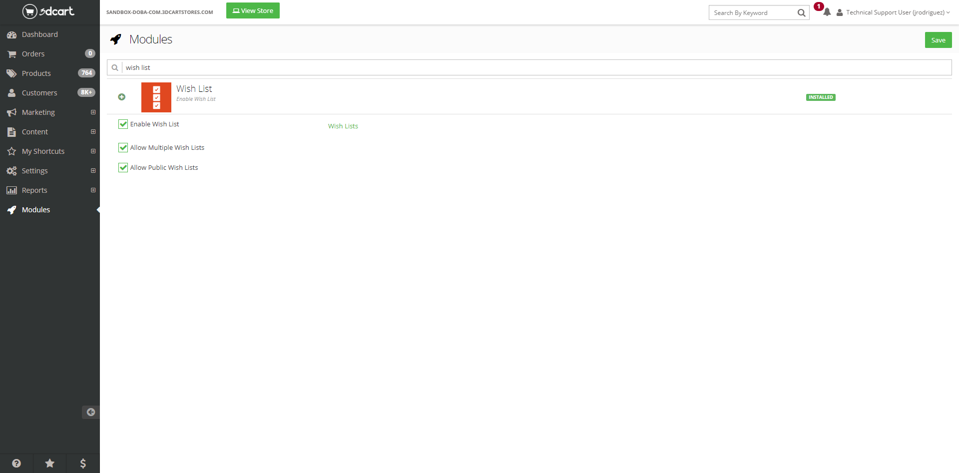 In your Shift4Shop Online Store Builder, click Modules in the left-hand navigation. You can scroll down to find the Wish List module or simply type wish into the search bar at the top to bring it up.