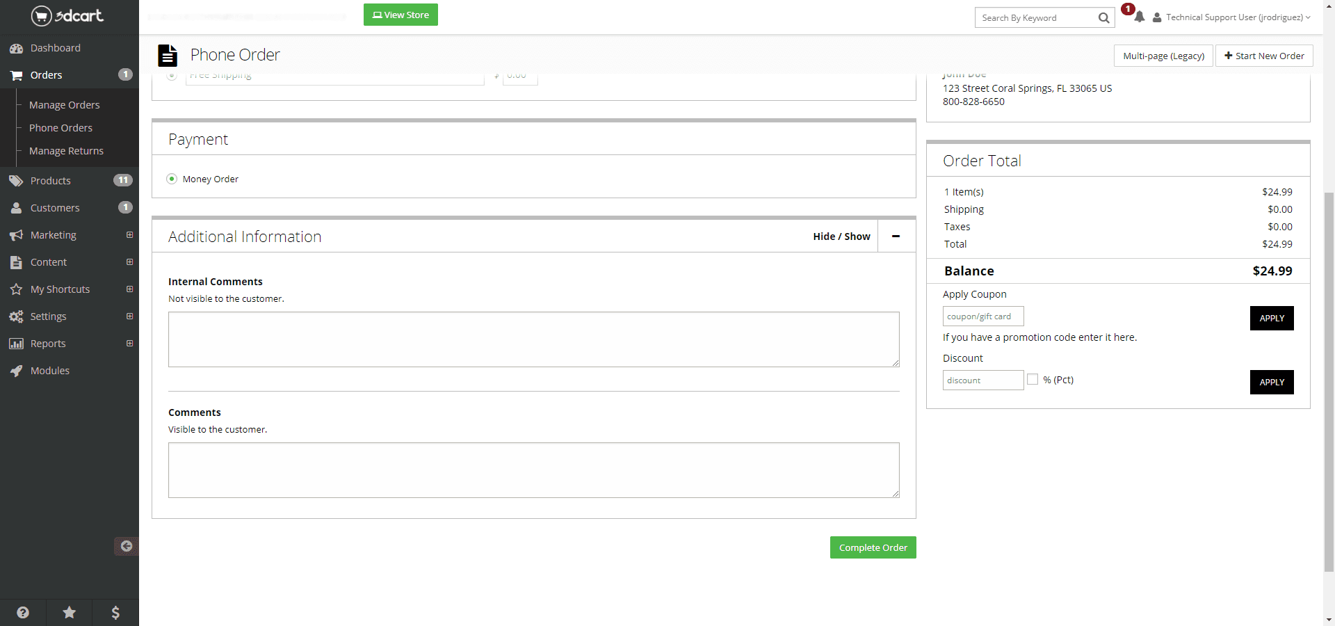 Shift4Shop provides a MOTO (mail-order / telephone order) built-in feature that allows you to process phone orders from a convenient interface in your Online Store Manager. Assign the order to a new or existing customer, add items quickly and easily, and complete their order in a few clicks. Billing, shipping, discounts and more are all available just as with a typical online order. And this interface isn’t tied to phone orders specifically — you can use it whenever you may need to create an order manually.