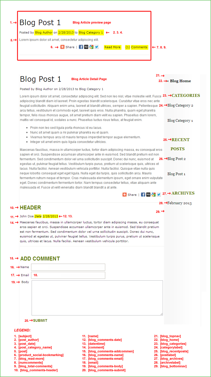 - [blog_comments-submit] - Displays the Title of the Add Comment "Submit" Button. (See Settings ->Design ->Store Language)
