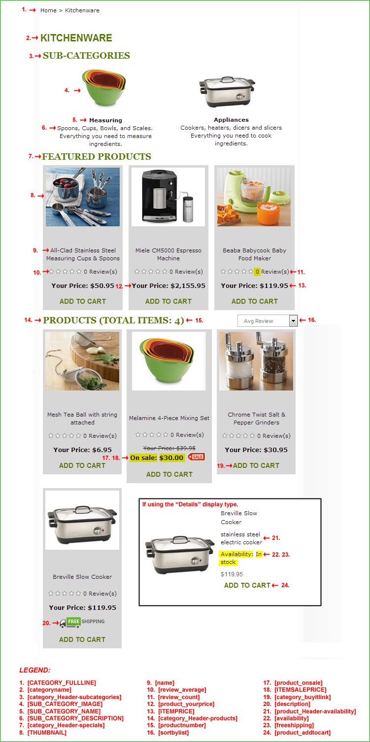 Notes: This is one of the more complicated templates as it contains many different code blocks. Not only does it utilize one or more global variables, but it also contains variables for the Category display as well as product display variables.