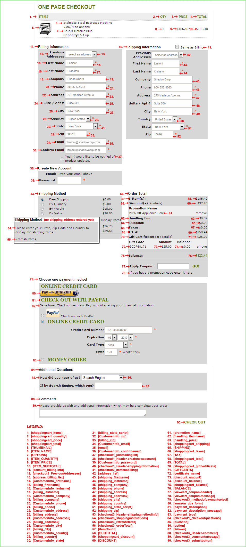 Purpose: This HTML template defines the layout of the single page checkout. Single page checkout will allow shoppers to enter their Billing and Shipping information all in one page. The option for Single Page Checkout can be enabled in Settings ->General ->Store Settings.