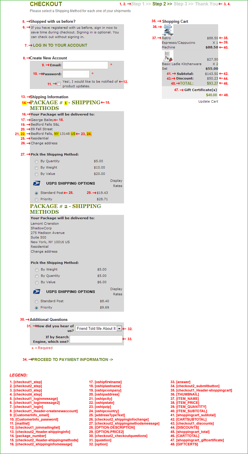 - [checkout2_shippingmethodsmessage] - Displays the Text for the "Pick the Shipping Method:" label on the shipping options section. (See Settings ->Design ->Store Language)