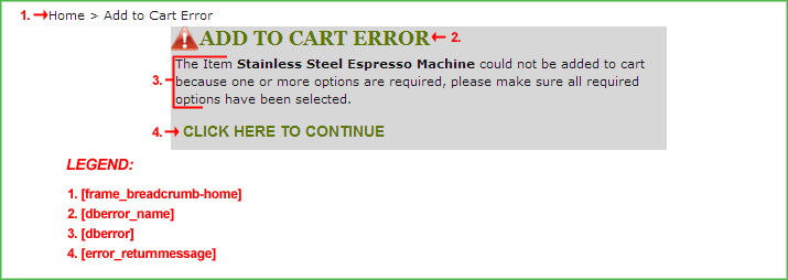 Note: The Error Messages shown can be caused by any number of factors. For example, adding an item to cart without selecting required options, accessing a bad link, etc. The wording of the actual error messages can be edited from the Online Store Manager by going to Settings ->Design ->System Messages