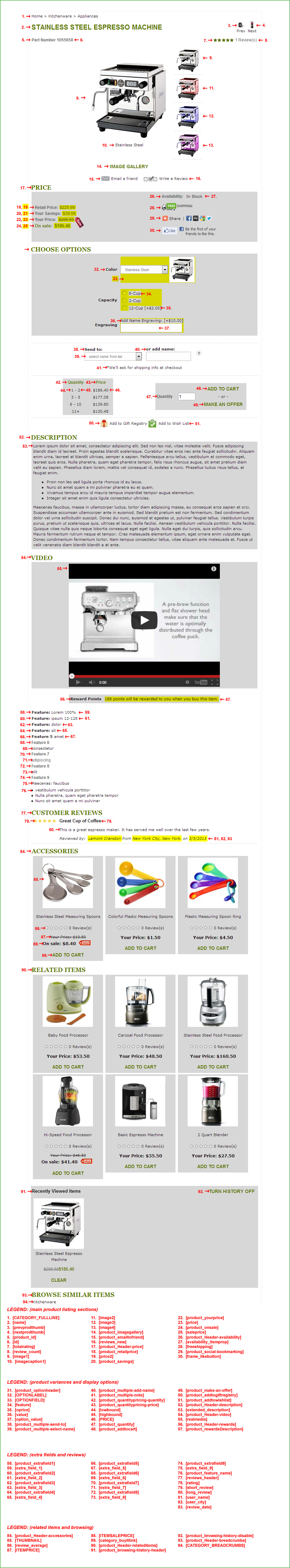 Purpose: This HTML template defines the layout of the Product Listing pages. The Shift4Shop store has four separate Product Listing templates created by default, but more can be created as needed. Product Listing templates can be selected in the "Advanced" tab of each product you create. Each style corresponds to an individual listing_x.html template.