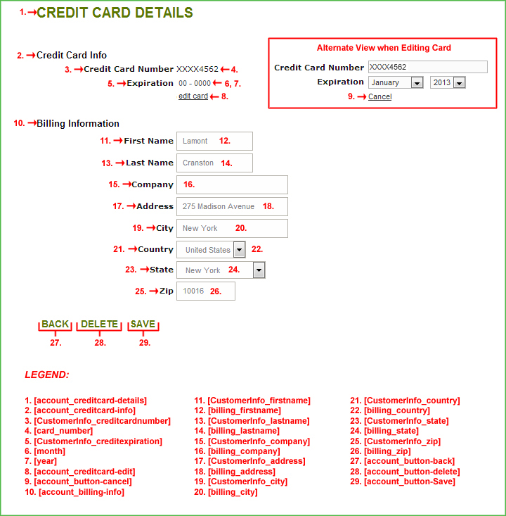 - [account_creditcard-details] - Displays the "Credit Card Details" Title of the page. (See Settings ->Design ->Store Language)