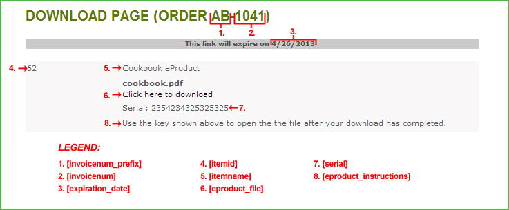 [invoicenum_prefix] [invoicenum] <!------ START: Confirmation ----------------------------------> [expiration_date] <!--START: items--> <!--START: itemid--> [itemid] <!--END: itemid--> [itemname] [eproduct_file] [catalogid] [orderkey] [file_count] <!--START: serial--> [serial] <!--END: serial--> <!--START: eproduct_instructions--> [eproduct_instructions] <!--END: eproduct_instructions--> <!--END: items--> <!------ END: Confirmation ------------------------------------>