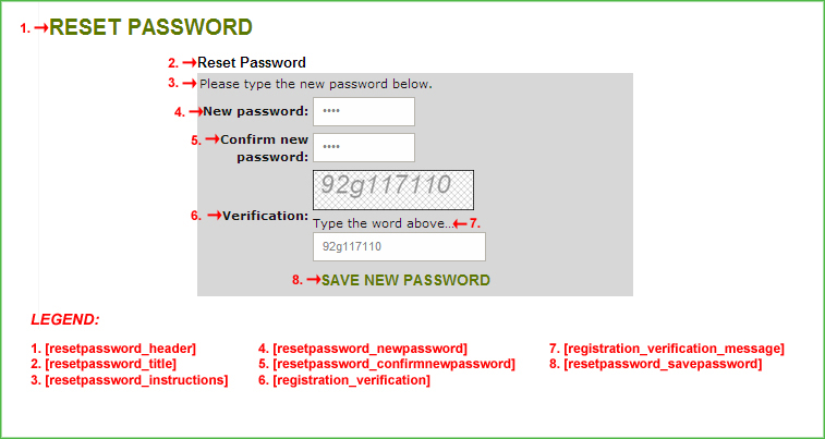 - [registration_verification_message] - Displays the Title of the CAPTCHA "Type the word above..." section of the reset form. (See Settings ->Design Store Language)