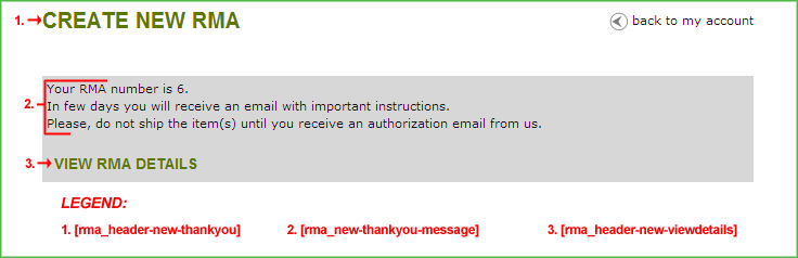 Purpose: This template controls the "Thank You" page which appears when customers submit a new RMA on the store.