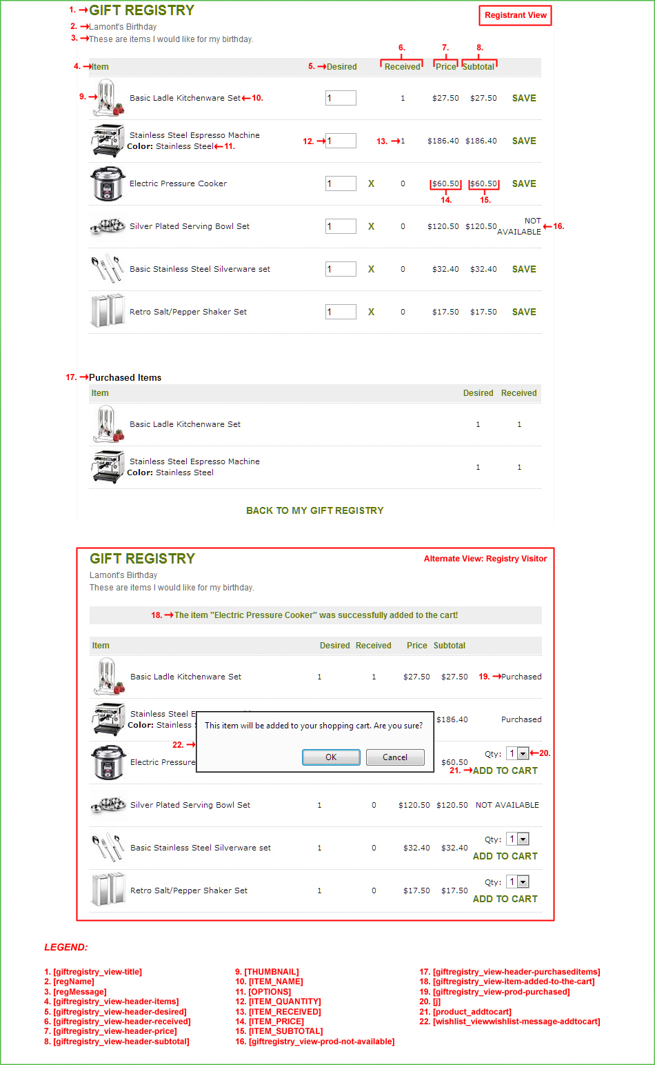 Note: This template also serves as the display for when Gift Registry visitors view items that a registrant has placed on their registry.