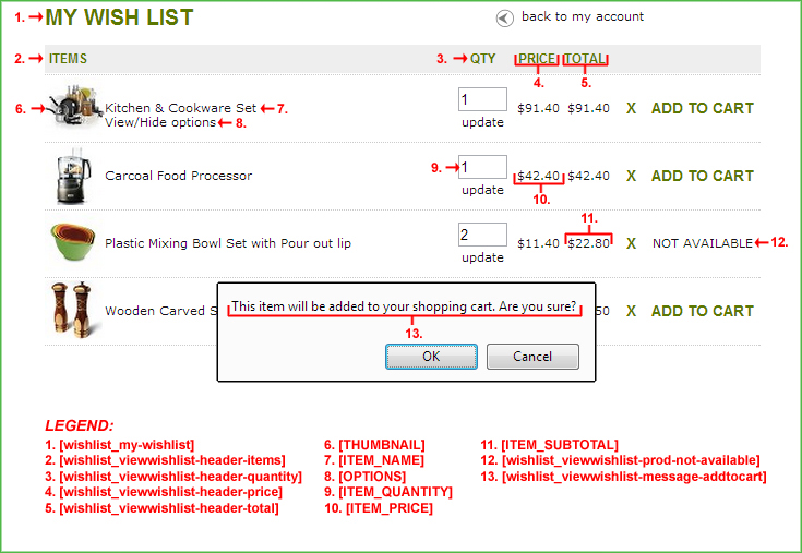 - [wishlist_viewwishlist-message-addtocart] - When clicking the "Add to Cart" link/button, this variable will display the "This item will be added..." confirmation popup message. (See Settings ->Design ->Store Language)