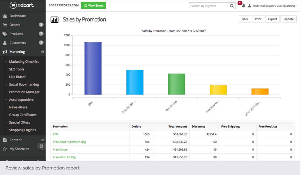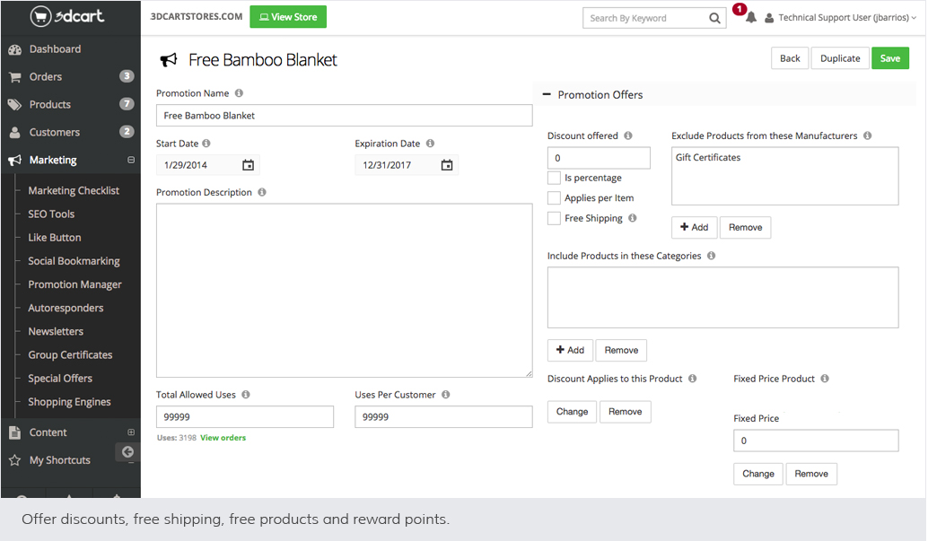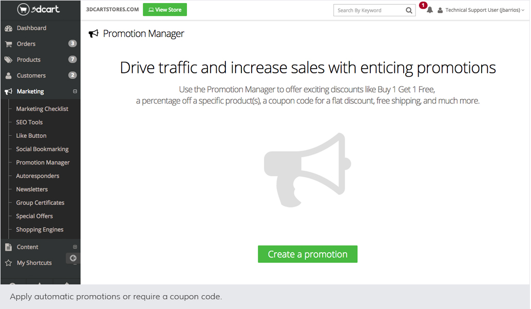At the left of your Shift4Shop Online Store Manager, click Marketing, and then click Promotion Manager. All your promotions and coupons are managed from this central location.