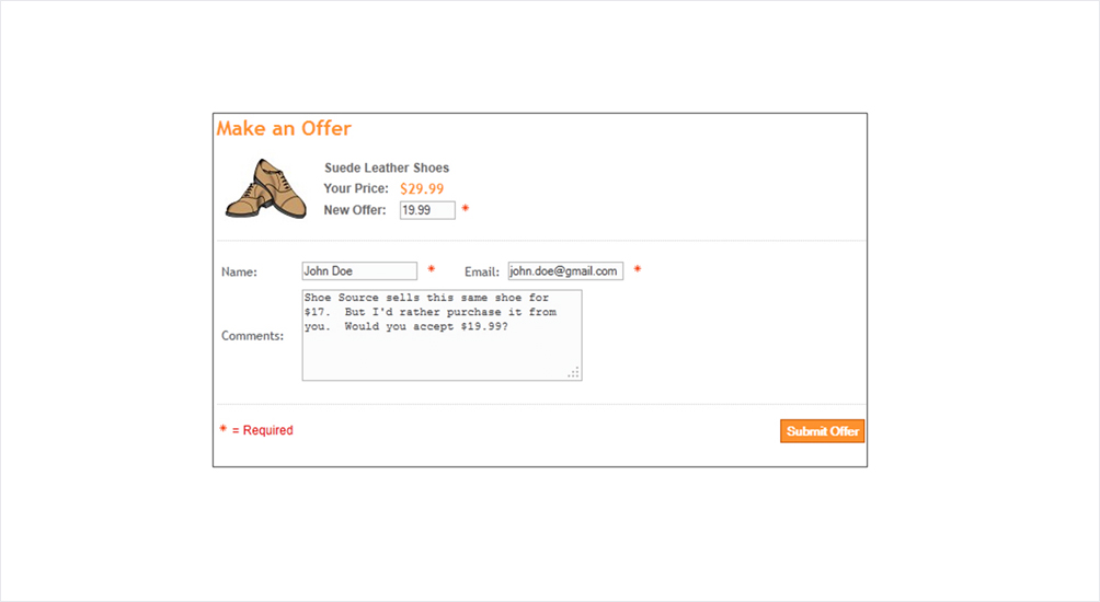 You can enable Make an Offer on specific products that you want your customers to be able to bid on. They can bid by clicking the Make an Offer button and entering their offered price, contact information, and an optional comment. Increase sales and customer engagement, appeal to shoppers’ bargaining sense, and gain an advantage over your competition with this handy app.