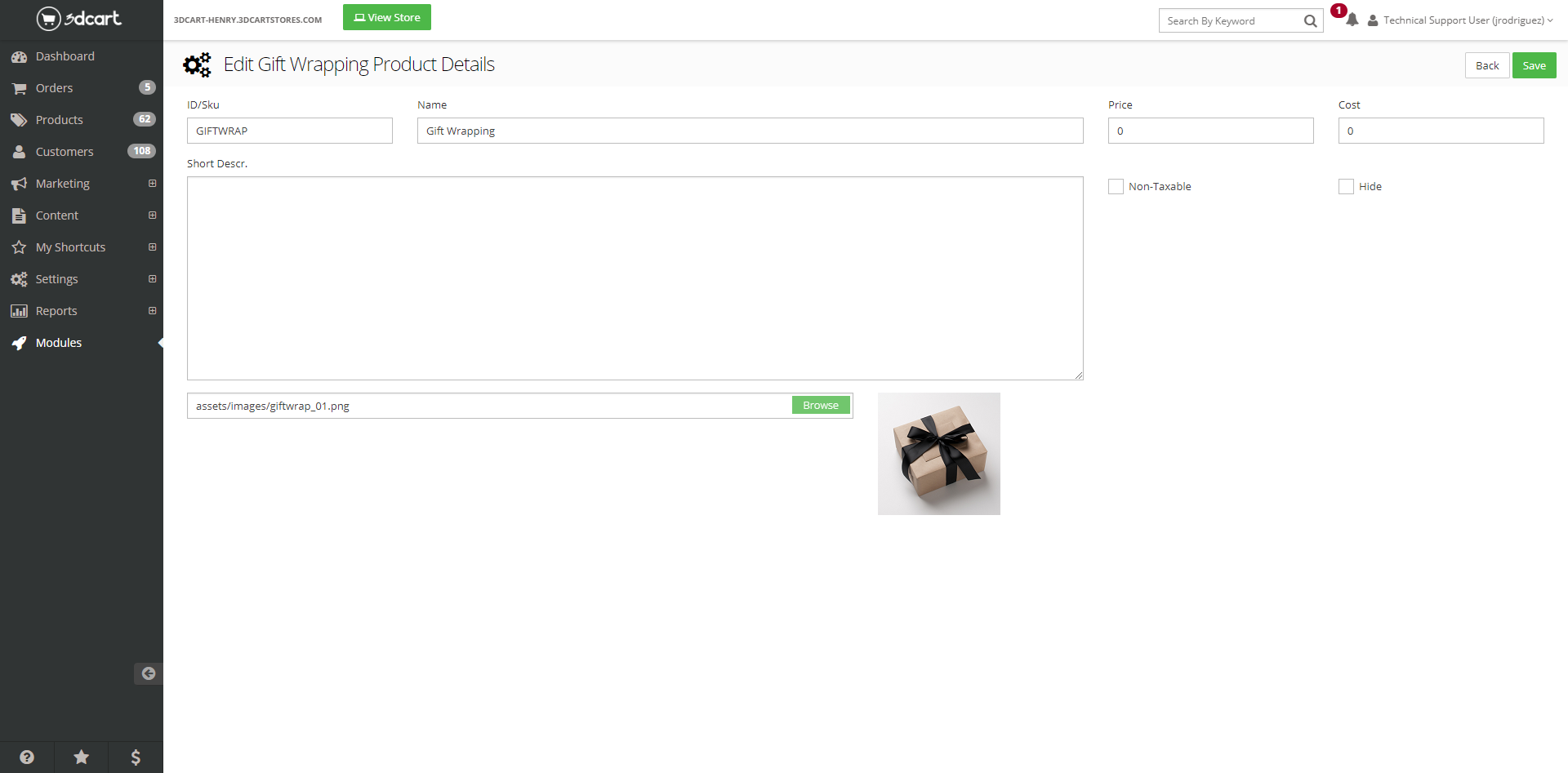 Under Modules in your Shift4Shop Online Store Manager, use the Search Bar or scroll down until you find Gift Wrapping. Click to expand the module, activate it, and access its settings.