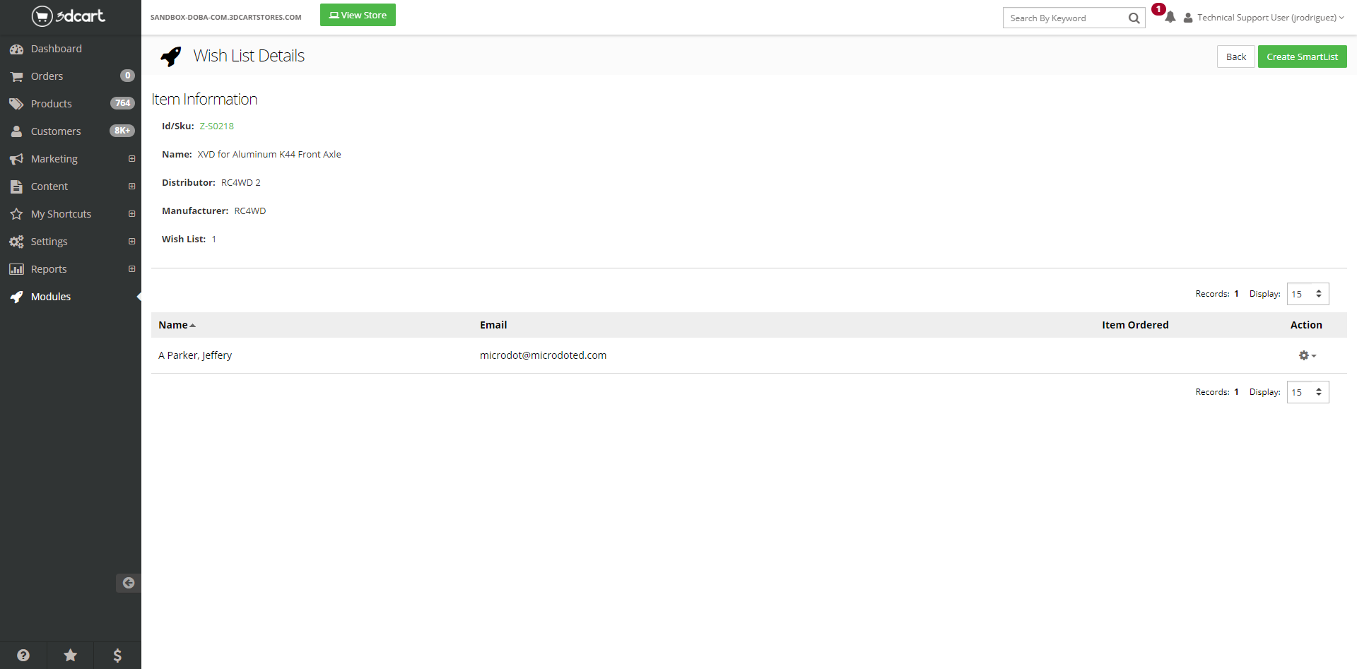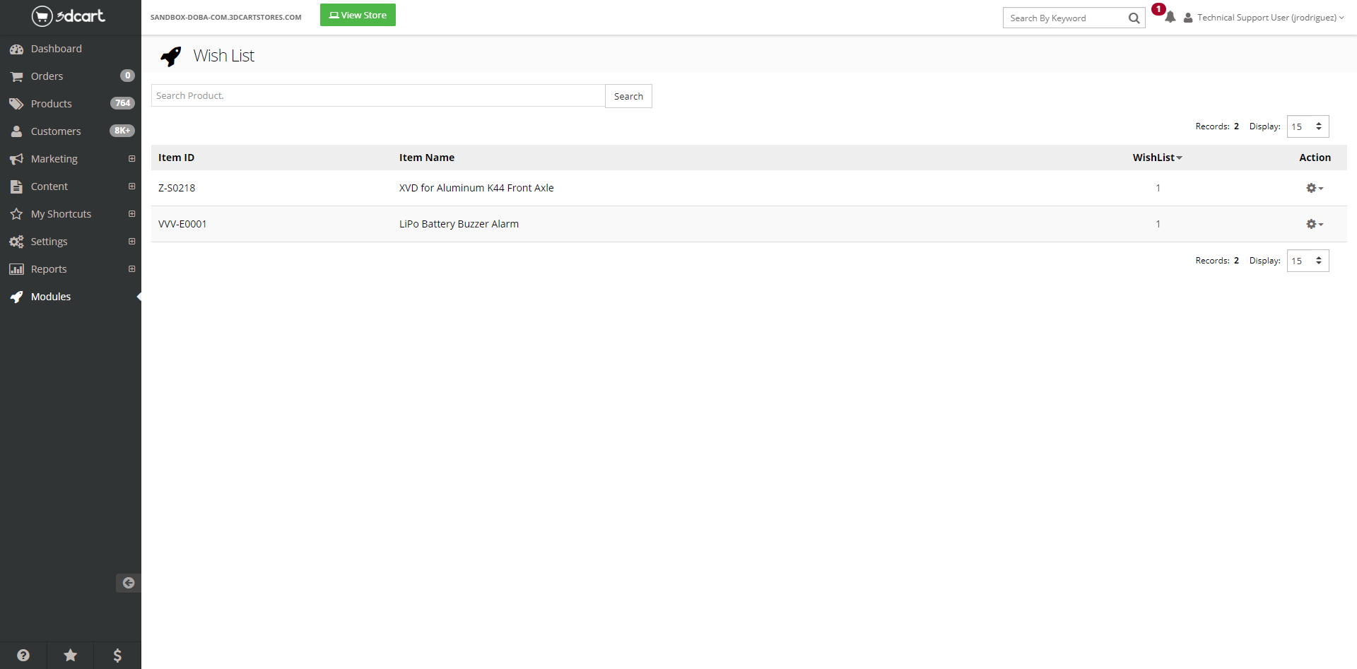 In your Shift4Shop Online Store Builder, click Modules in the left-hand navigation. You can scroll down to find the Wish List module or simply type wish into the search bar at the top to bring it up.