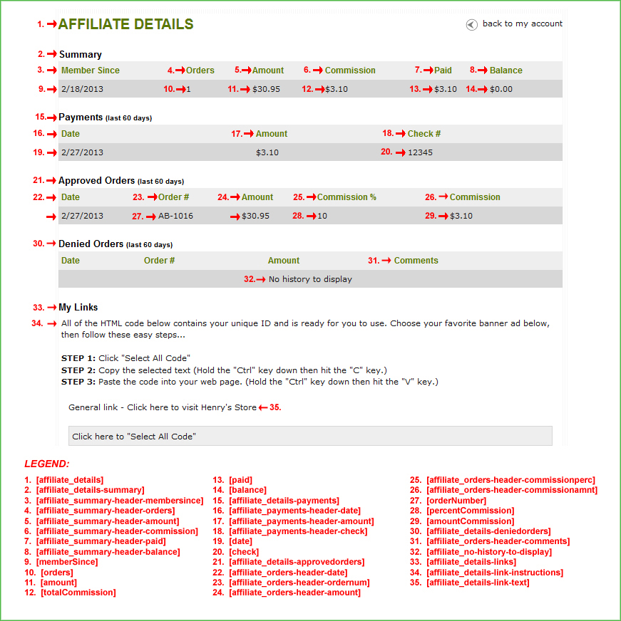 Purpose: This HTML template defines the layout of the affiliate system as seen by your shoppers/affiliates when they view their affiliate information page within the "My Account" page.