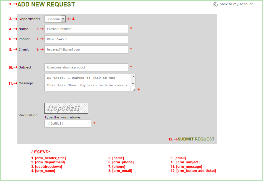 Notes: This template is almost identical to the contact_us.html template in that it contains the basic CRM form. However, this page is specifically invoked when clicking on the "Add Request" link in the customer's "My Account" page.