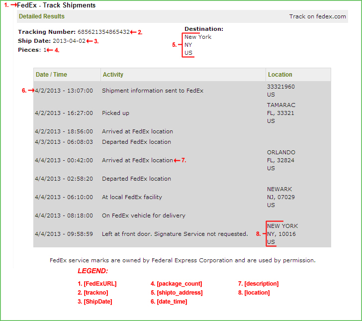 Purpose: This template is used to display the order's tracking information when tracking an order that is shipped via FedEx.