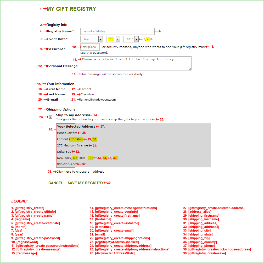 - [giftregistry_create-name] - Displays the Title of the "Registry Name" heading on the page. (See Settings ->Design ->Store Language)