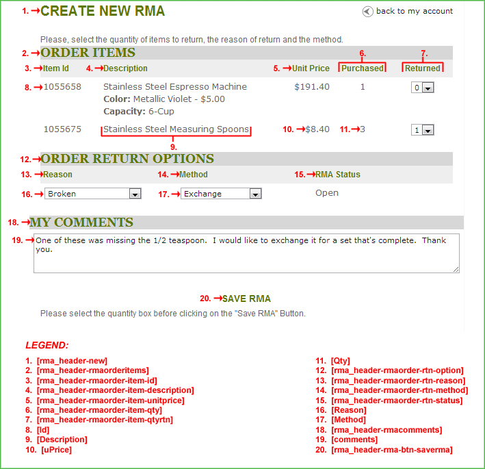 - [rma_header-rmacomments] - Displays the Title of the "My Comments" heading of the page. (See Settings ->Design ->Store Language)