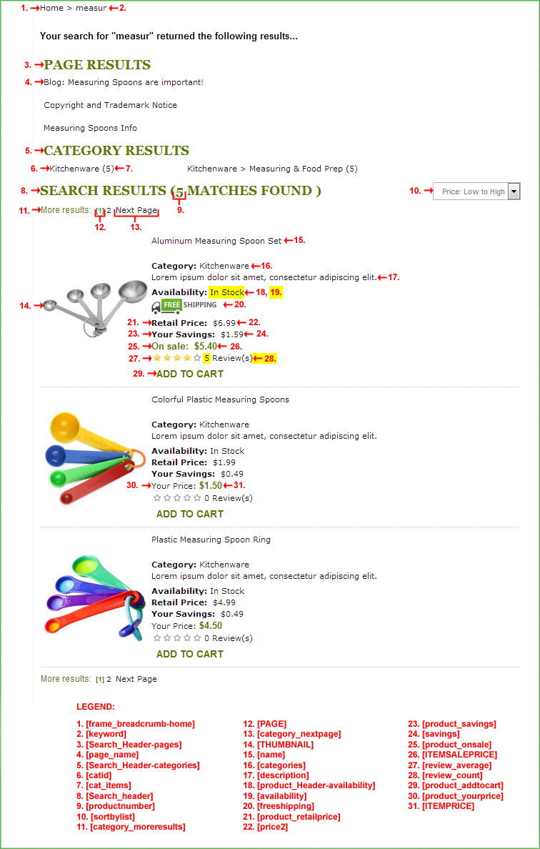 Notes: The template contains certain blocks that are dependent on whether the store is set to enable search results for additional pages and categories. More information on this will be contained in the Variables listing of this page.